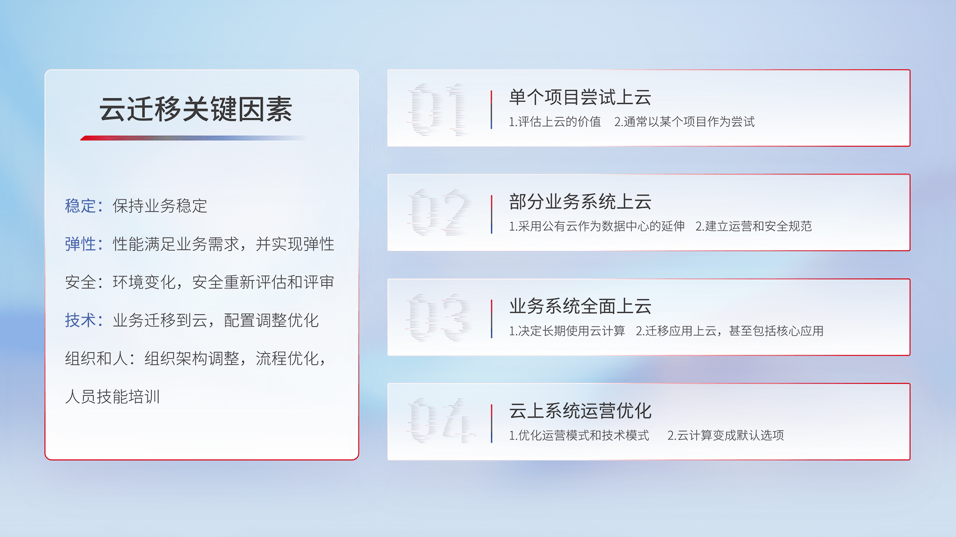 结合实际业务,,,从规划设计、、云平台选型、、、云原生改造、、、、数据迁移、、、集成交付,,迁移全过程为客户识别最佳上云路径,,做好风险识别管理,,设计网络架构、、、、身份权限、、、安全审计合规、、、操作审计、、日志审计、、、监控告警策略、、、多站点容灾设计等,,,,对云上基础设施进行整体规划,,,,提升IT治理水平,,以满足弹性、、、高可用、、、、高性能的需求。。。。