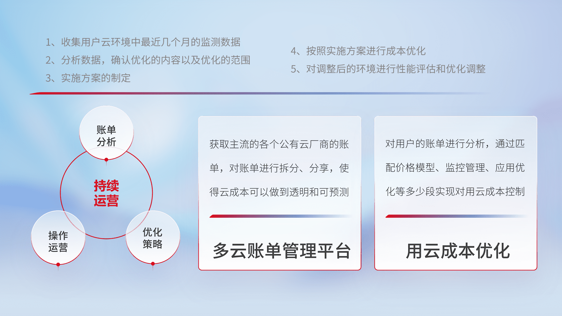 通过灵活运用多种自动化迁移工具,,,帮助企业用户实现业务和数据高效 、、、稳定的上云迁移和云上迁移,,,,采用自研多云纳管平台,,,,以中立管理模式,,,解决多组织、、、、多云、、、多运维厂商的复杂关系的管理,,,,保证多云平台资源配置的一致性,,,实时掌控云资源运行数据,,,,运用智能化工具分析云资源多云平台的管理服务,,,透明化管理成本支出,,用云成本可预测、、用云费用可优化、、、云资源配额有据可依。。。。
