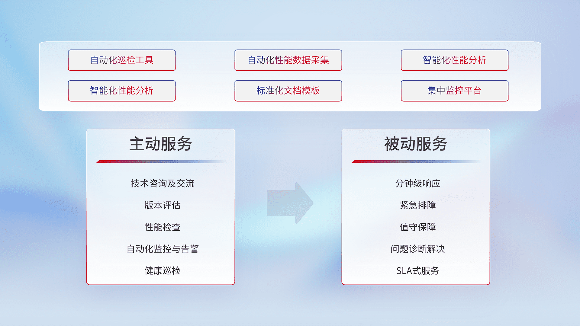 智能化工具和标准化文档,,保障服务质量,,提供主动服务(包含技术咨询、、版本评估、、性能检查、、、、自动化监控与告警、、、、健康巡检)和被动服务包含(分钟级响应、、紧急排障、、值守保障、、、、问题诊断解决、、、SLA服务)。。。。